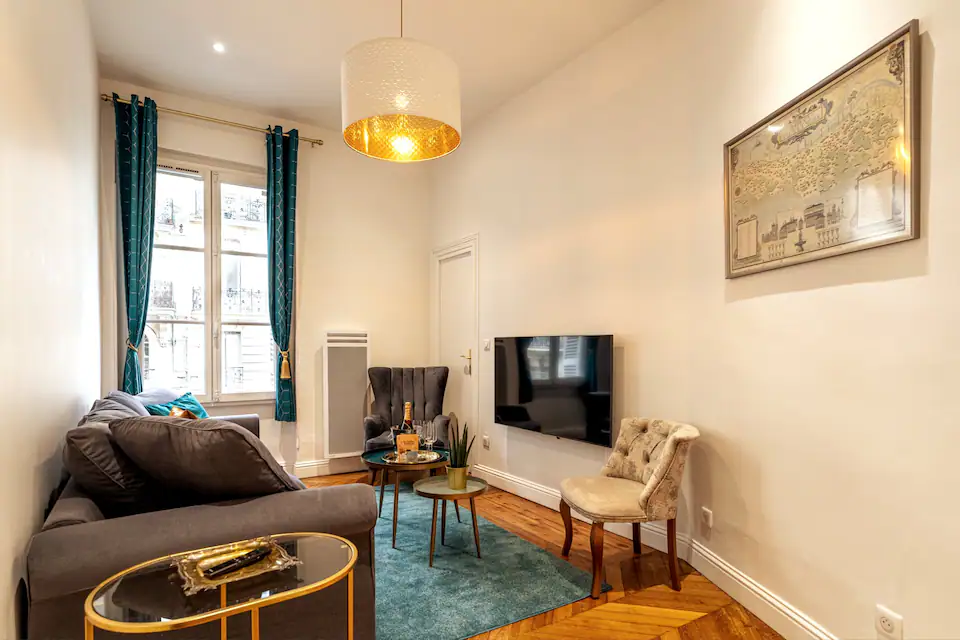 Living Room: on the right upon entering the apartment the living room is decorated in formal french style and can easily seat 6 people on comfortable sofas and armchairs. A 65 inch flat screen smart TV ensures entertainment and access to your favourite TV apps including complimentary Netflix. An adjacent toilet is attached to the living room.